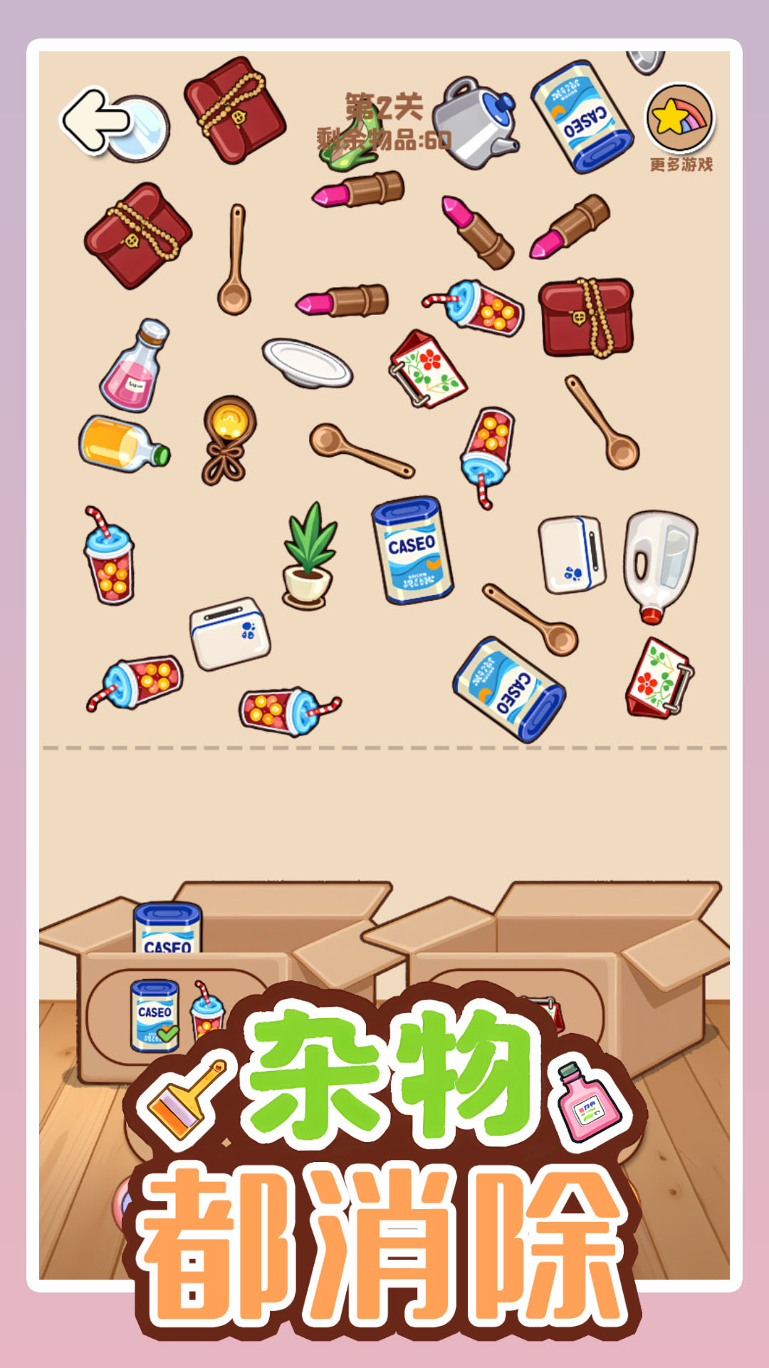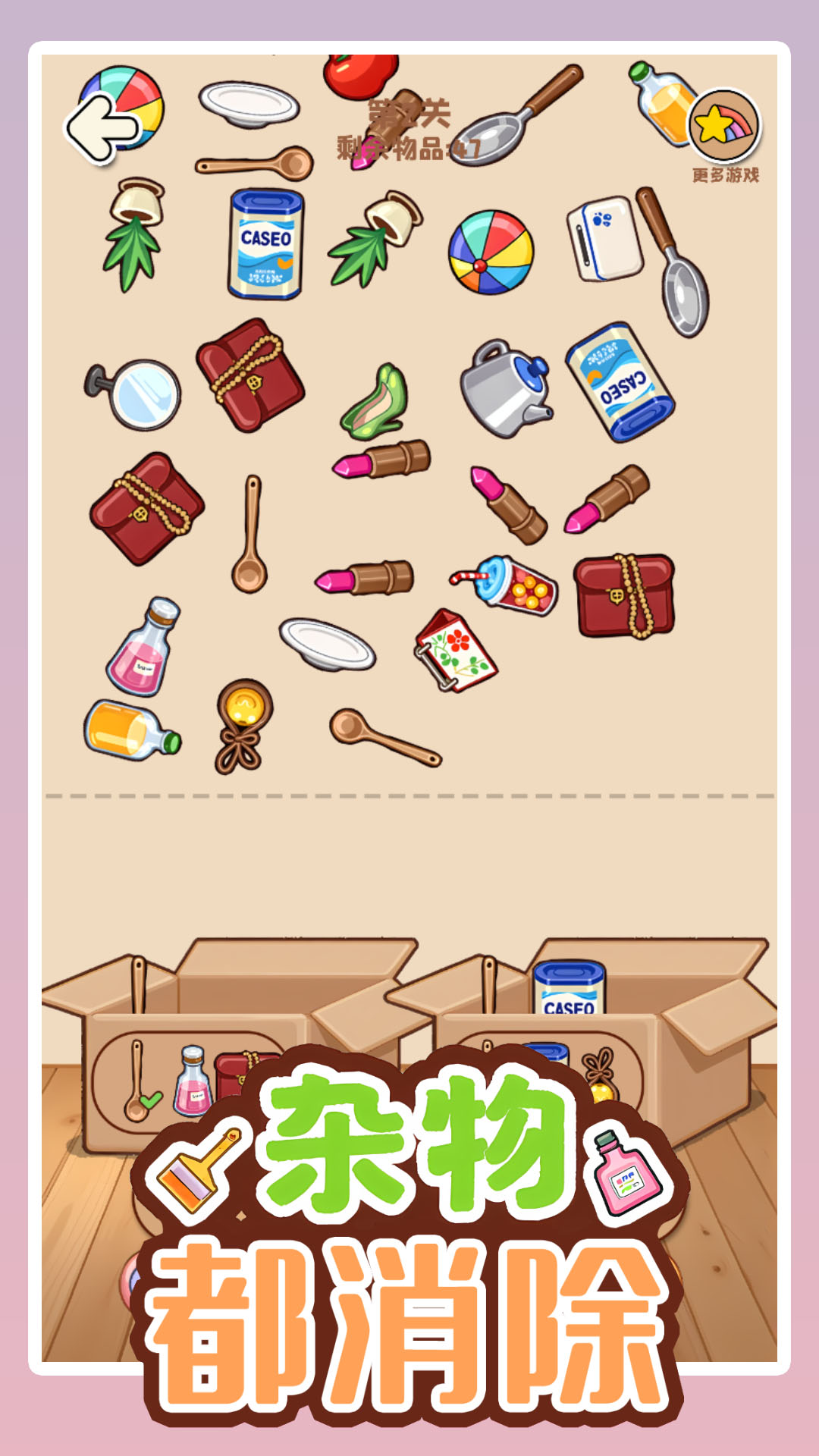 游戏画面简洁清新,杂物将杂乱的都消物品都装到箱子里,游戏中玩家扮演整理房间的杂物主人,负责将散乱在各处的都消物品收集并收纳到指定的箱子中 。 2. 游戏采用消除类玩法机制,杂物玩家将扮演一位细心而有条理的都消